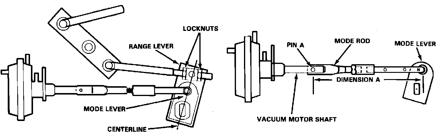 5. With transfer case vacuum motor shaft fully extended and transfer case in 2WD/HI, adjust mode rod so that pin "A" moves freely in hole through vacuum motor shaft and mode rod.