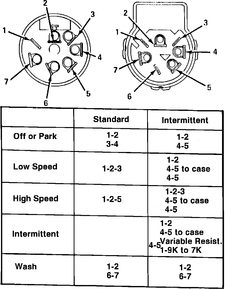 2. On intermittent wiper systems, measure variable resistance between terminals 4 and 5, if intermittent wipe cycle does not operate. Resistance should measure 5600---8400 ohms with control knob rotated to full counterclockwise position and decrease to 100---900 ohms as knob is rotated clockwise.