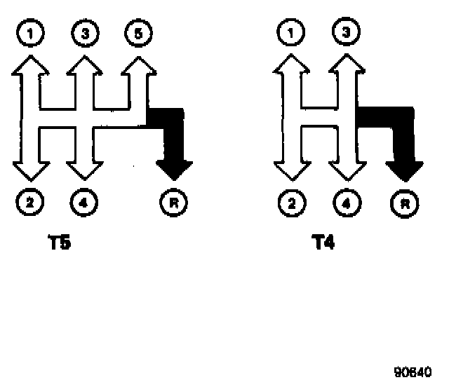 To shift to reverse gear for both T4 and T5 transmissions, press the gearshift lever to the extreme right and rearward. To shift from reverse gear, move the gearshift lever back to the neutral detent position.