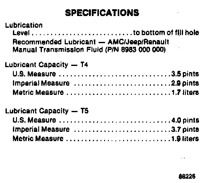 The specified lubricant for both T4 and T5 transmissions is AMC/Jeep/Renault Manual Transmission Fluid (P/N 8983 000 000). Do not use any other type of fluid when adding to or refilling a transmission.