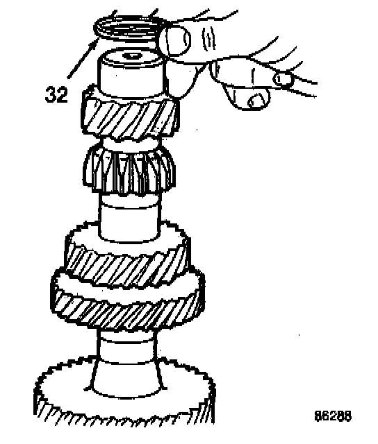 Install the countershaft rear bearing spacer (30) and retaining snap ring (29).