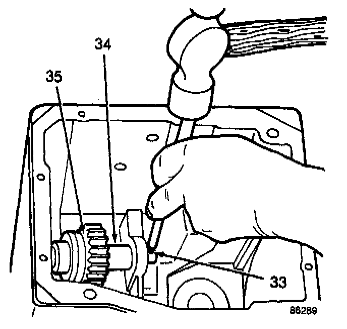 Position the reverse idler gear (35) in the case with the shift lever groove facing the rear of the case. Install the reverse idler gear shaft (34) from the rear of the case. Install the retaining roll pin (33) in the shaft.