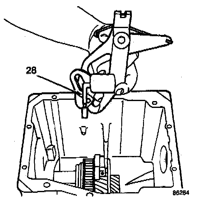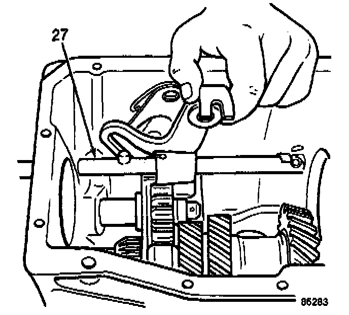 Insert the fifth-reverse gear shift rail through the opening in the rear of the case and install it in the fifth-reverse gear shift lever. Rotate the rail (27) during installation to simplify engagement with the lever.