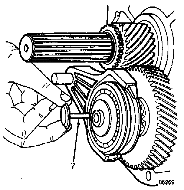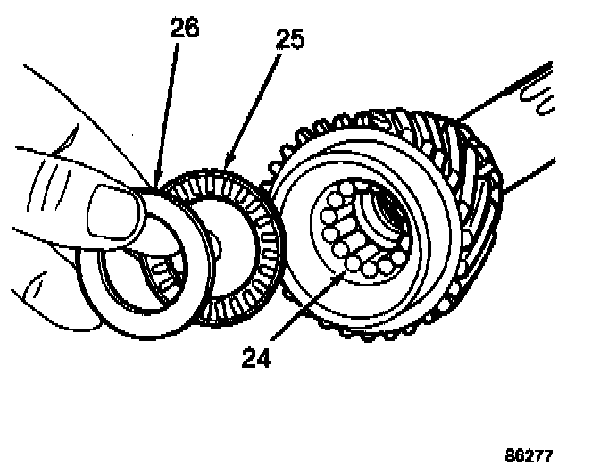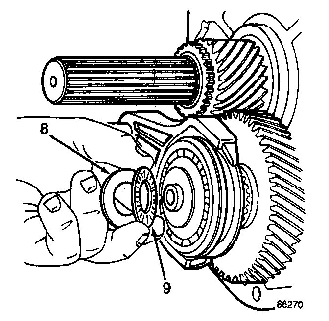 Install the needle-type thrust bearing (9) against the thrust bearing race on the countershaft. Coat both the thrust bearing and race with petroleum jelly.