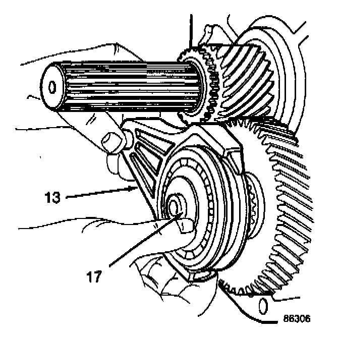 Position the assembled fifth gear synchronizer sleeve on the fifth gear shift fork (13) and slide it onto the countershaft (17) and the fifth-reverse gear shift rail.