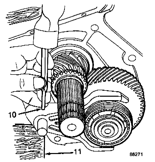 Place the assembled fifth-reverse gear shift rail and shift fork on a block of wood (11) and install the retaining roll pin (10).