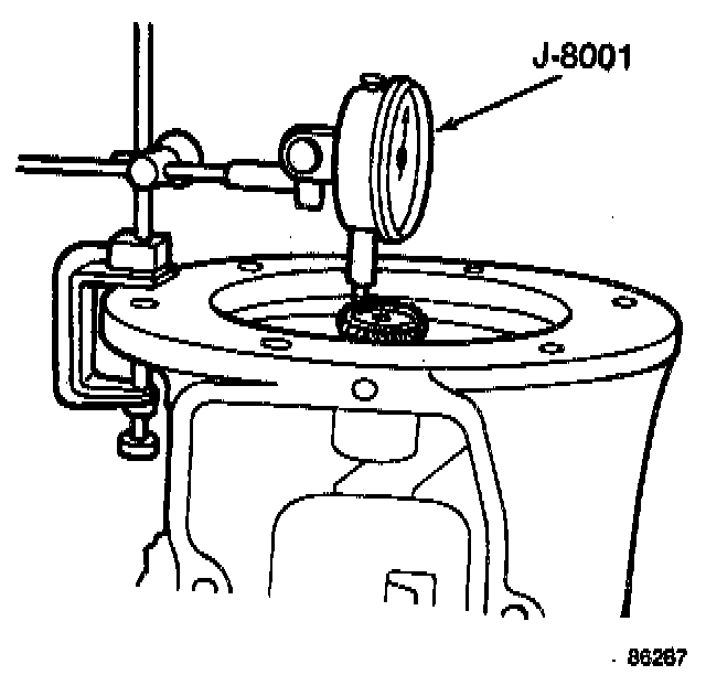 Position the transmission case on its end. Attach a dial indicator (J-8001) on the adapter housing with the indicator stylus located on the end of the output shaft.