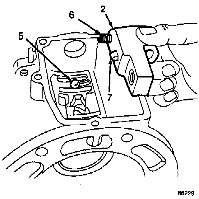 Install the adapter housing over the output shaft and the shift rail at a position where the shift rail just enters the shift cover opening. Install the detent spring (6) in the offset lever (2). Place the detent ball (5) in the neutral guide plate detent. Apply force on the detent ball with the detent spring and offset lever and slide the offset lever onto the shift rail.