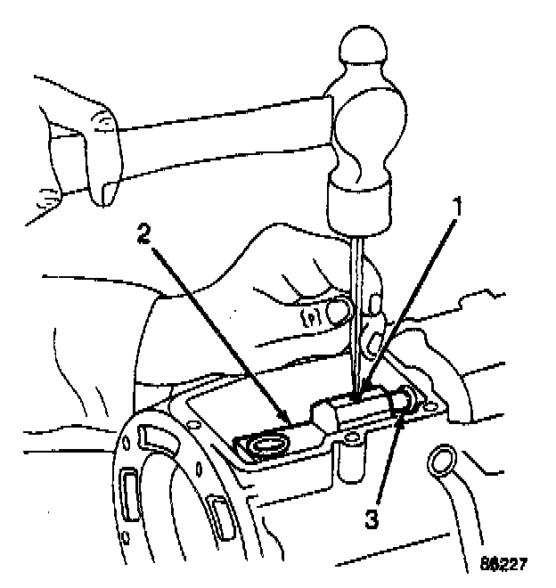 Install the roll pin (1) in the offset lever (2) and shift rail (3).