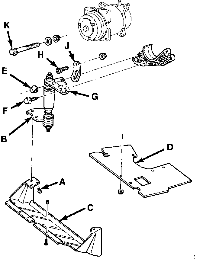 8. Remove the torx head bolt (H) that holds the compressor adjusting strap (J) to the compressor and remove the strap.