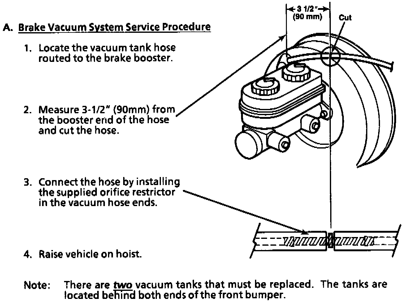 1. Locate the vacuum tank hose routed to the brake booster.2. Measure 3-1/2" (90 mm) from the booster end of the hose and cut the hose.