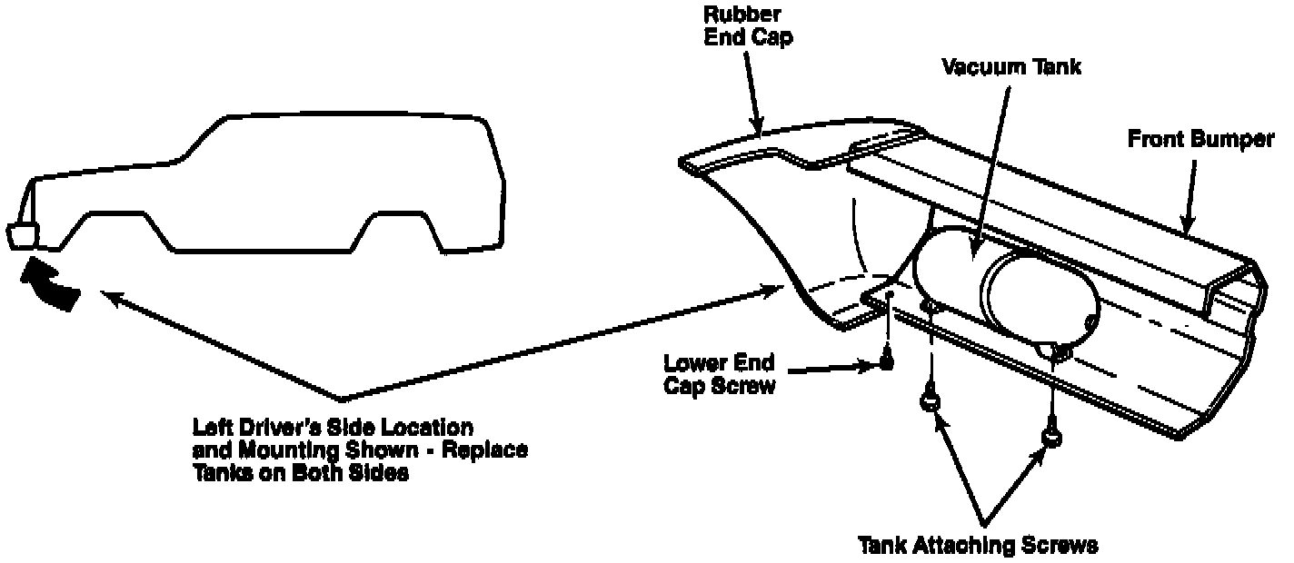 There are two vacuum tanks that must be replaced. The tanks are located behind both ends of the front bumper.