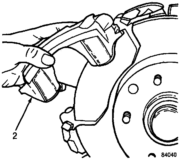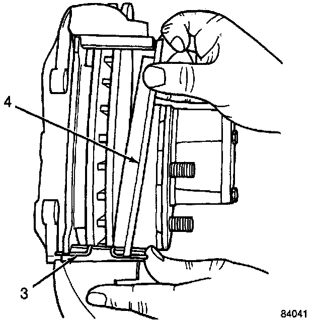 2. Position the inboard and outboard brake pads (4) in place while holding the clip (3).