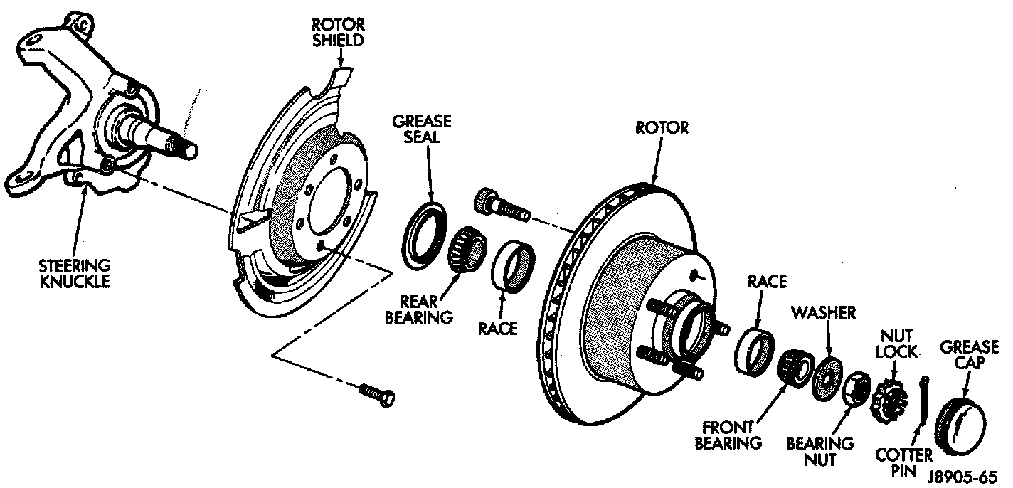 1. Clean and repack bearings with Mopar or equivalent wheel bearing grease. Then coat spindle, bearing races and rotor hub cavity with bearing grease.