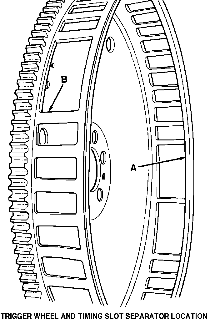 (B) in the trigger wheel. Replace the flex plate assembly if the separators are dented, distorted, broken, or bent. Do not attempt to repair the wheel as the results are usually not satisfactory.