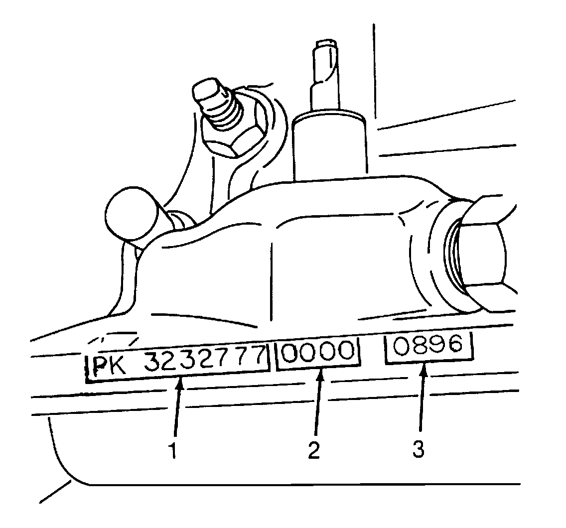 A seven-digit transmission part number (1) is stamped on the left side of the case just above the oil pan mating surface. This number is followed by a four-digit code number (2) which indicates date of manufacture.
