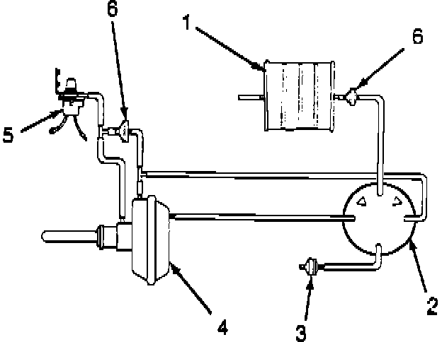The Command-Trac vacuum control system consists of a vacuum storage tank (1), a vacuum control switch (2), an air vent filter (3), a vacuum shift motor (4), a four-wheel drive indicator light and vacuum switch (5), two vacuum check valves (6) and an interconnecting vacuum harness.