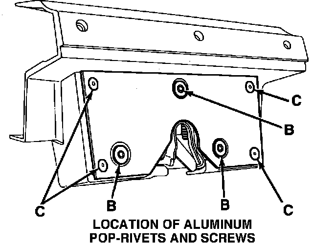 6. Drill three 4 mm holes and install four 3.5 mm diameter by 11 mm aluminum pop-rivets at (C).
