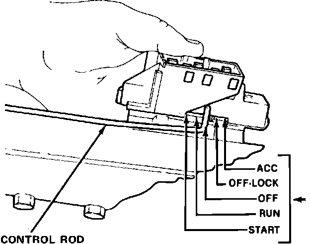 5. Position switch slider to the ACCESSORY position as shown. Place ignition key in ACCESSORY position, then insert control rod into switch and install attaching screws. On standard column vehicles, the accessory position is to the extreme left, with the left side of the ignition switch facing toward the steering wheel. On tilt column vehicles, the accessory position is to the extreme right, with the right side of the switch facing downward from the steering wheel.