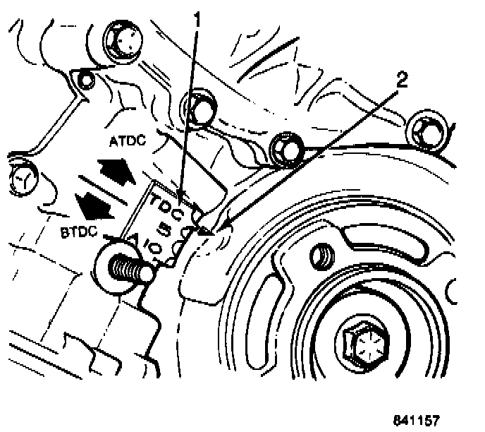 A milled index notch (2) in the vibration damper is used to align the number 1 cylinder ignition position of the crankshaft with the correct timing degree mark on the graduated scale.