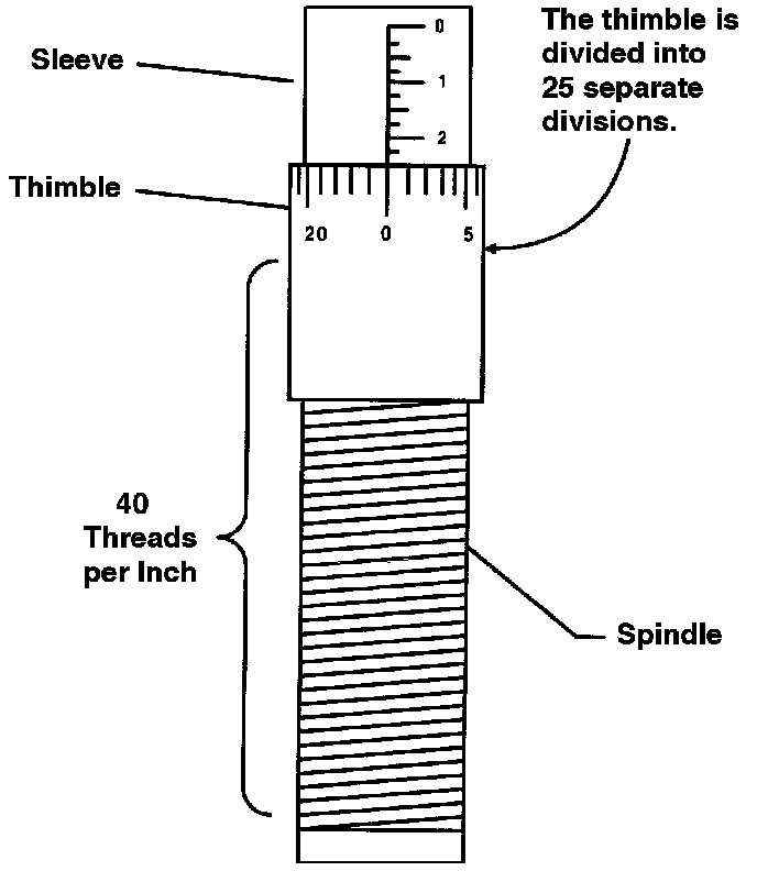 The thread pitch on the spindle is 40 threads per inch. A single full rotation of the thimble extends or retracts the spindle one thread or 1/40 of an inch (0.025, 25 thousands).