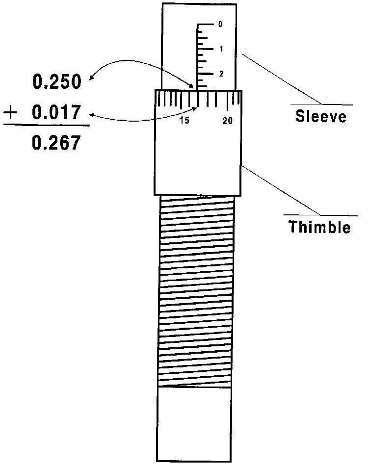 In the example the sleeve measurement is 0.250 inches and the thimble measurement is 0.017 inches. The total measurement is then equal to the two measurements combined, 0.267 inches.
