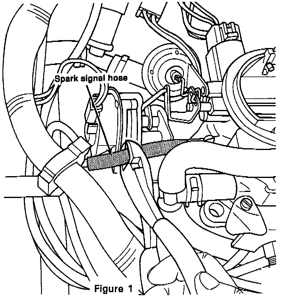 1. Remove the air cleaner assembly.2. Locate the spark signal hose on the choke side of the carburetor. Cut the hose two inches from the carburetor as shown in Figure 1.