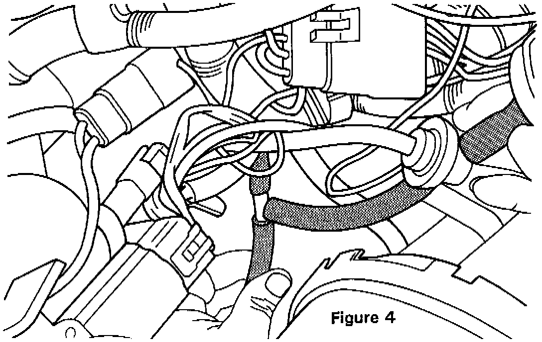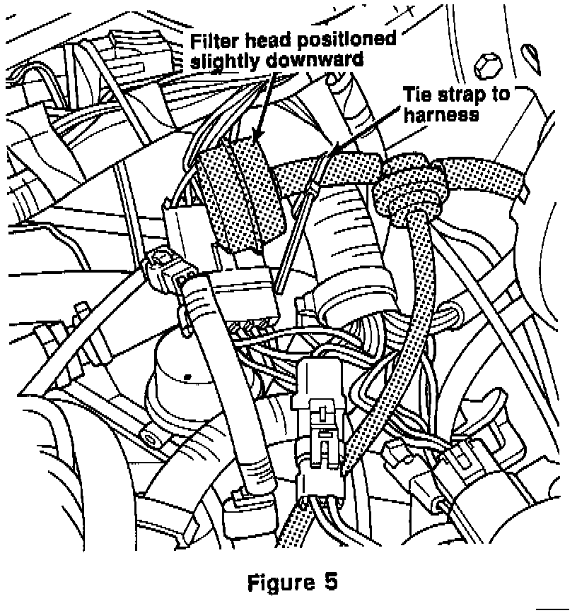 6. Secure the harness filter assembly to the convolute covered electrical harness (above the coolant hose) behind the carburetor with the supplied tie wrap. Make sure to point filter head downward as shown. (Figure 5).