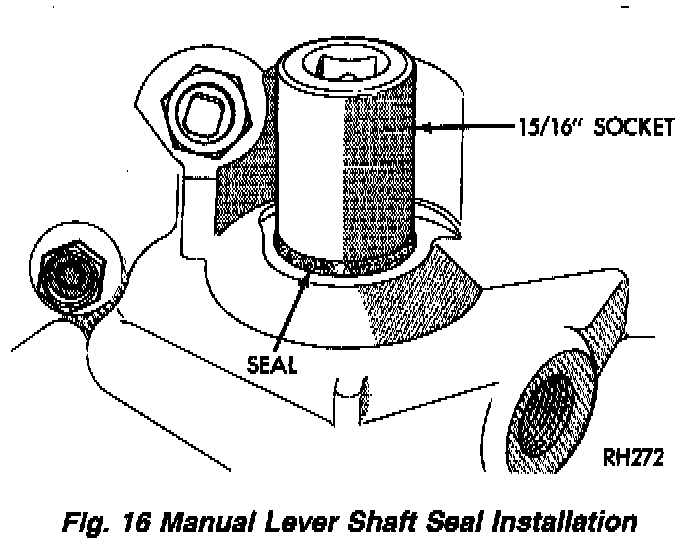 3. Check condition of manual lever shaft seal in transmission case. Replace seal if lip is cut, or worn. Install new seal with 15/16 deep well socket (Fig. 16).