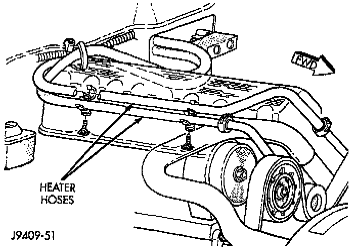 13. Disconnect the heater hoses at the engine thermostat housing and water pump.