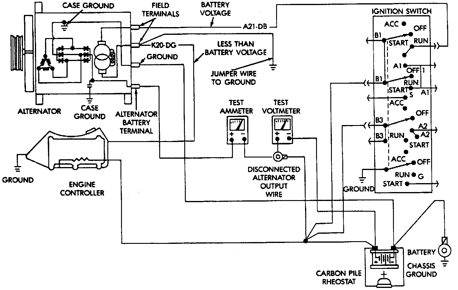9. Start engine and operate at idle speed, then adjust carbon pile and engine speed to maintain a 20 amp circuit flow. Note voltmeter reading. Voltmeter reading should not exceed 0.5 volt.