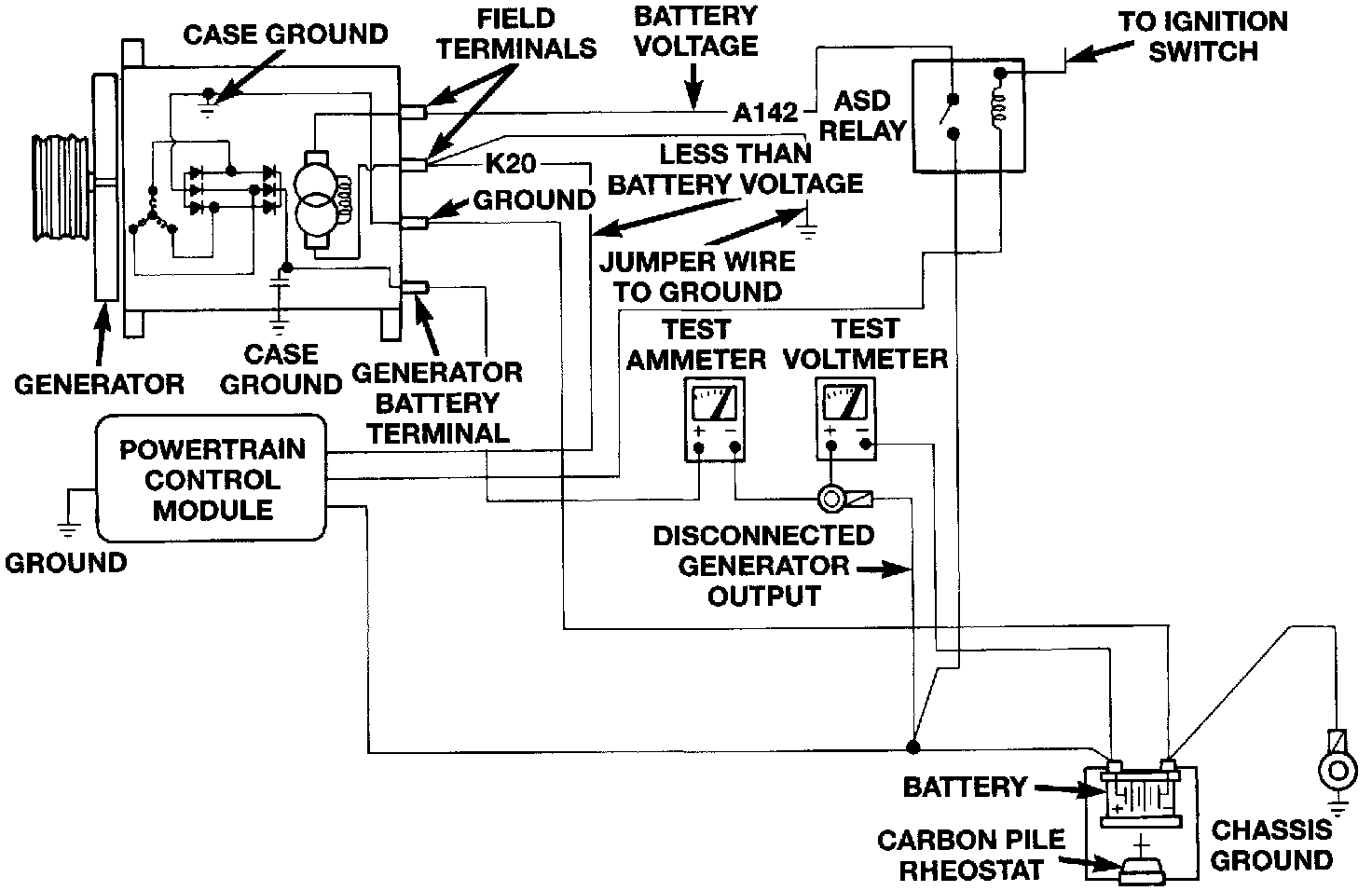 6. Connect suitable jumper wire to ground and K20 (field driver) terminal at rear of alternator. This may generate a fault code. Do not connect powered field circuit to ground, as component damage will occur.