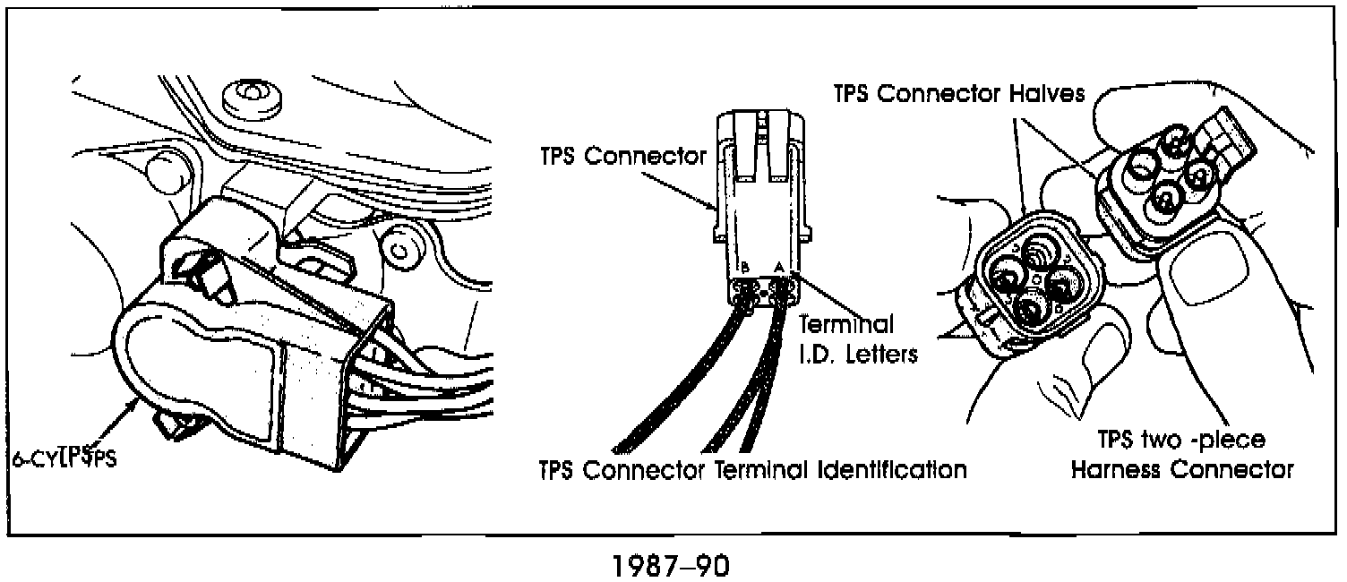 The 1987-90 sensor has two pigtail leads. One has an in-line three pin connector, containing three wires. The other has a square four pin connector with three wires. The square connector is the one that is used for the transmission controller. These wires can be identified by the letters which are stamped into the connector.