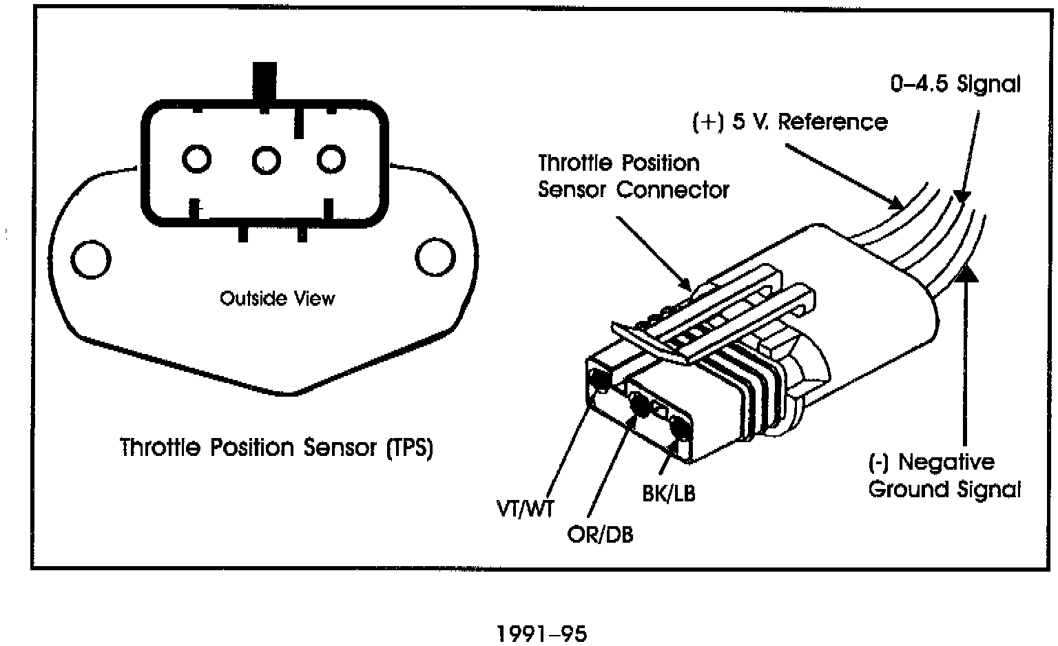 In 1991 Chrysler changed the TP design to one that was more conventional. Now, instead of having two harness connectors (one for the engine controller, the other for the transmission controller), they share the sensor signal from a common wire. Testing this sensor is similar to the earlier design (1987-90), however, the sensor signal is low at an idle and increases as the throttle is opened. Full-throttle voltage is approximately 4.5v. Signal voltage should change smoothly as the throttle is moved. If the signal moves erratically or is not within specifications, the sensor must be replaced, it is not adjustable.