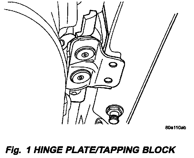 1. Position hinge reinforcement bracket on "A" pillar and place tapping block behind the upper hinge with foot facing outside of vehicle (Fig. 1).