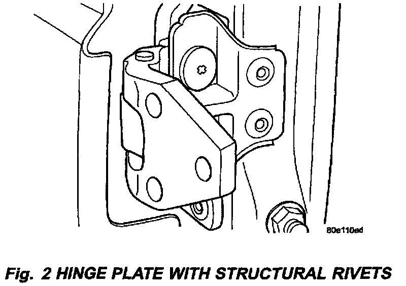 This procedure involves installing a hinge reinforcement and tapping block kit (B) p/n 05083061M. Each repair kit contains parts to service one upper hinge. The kits are universal in design and work on the right or left side.