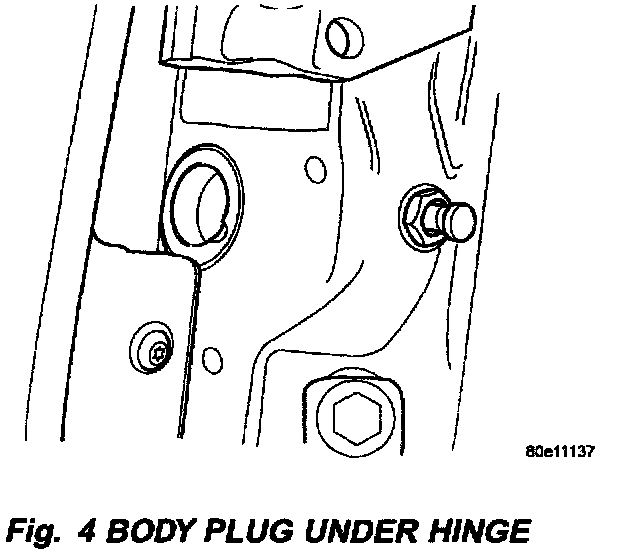 9. Remove body plug under upper hinge on "A" pillar where hinge plate will be located. (Fig. 4)