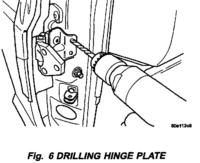 16. Using the hinge reinforcement bracket mounting holes as templates, drill two 17/64th inch holes in the "A" pillar. (Fig. 6).