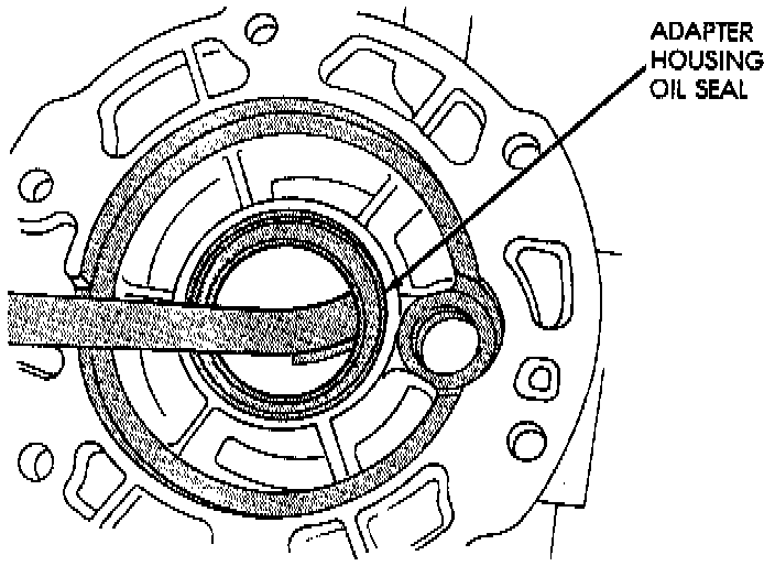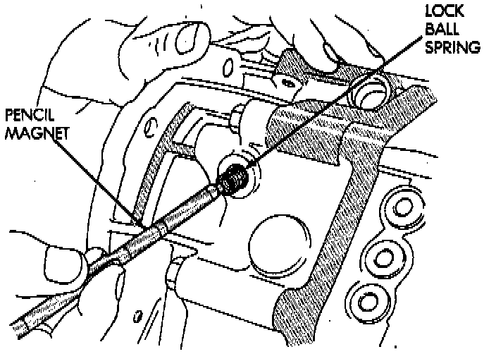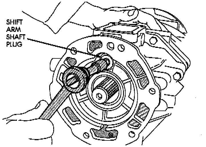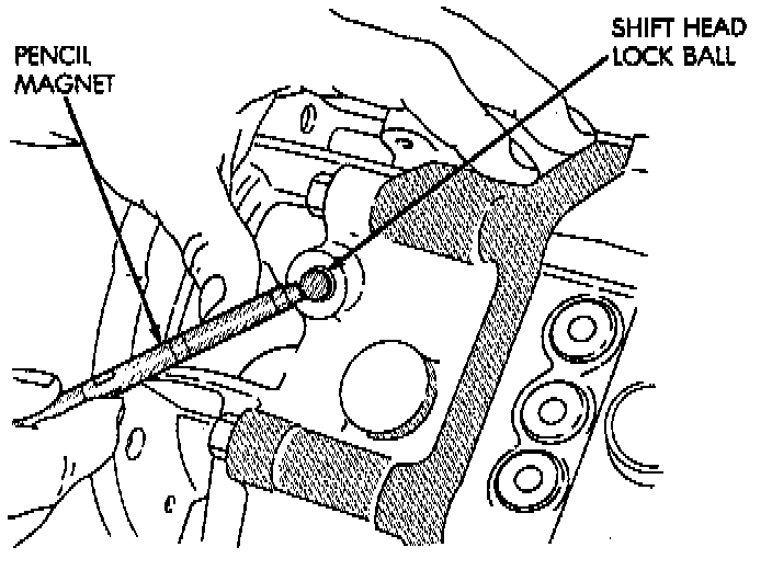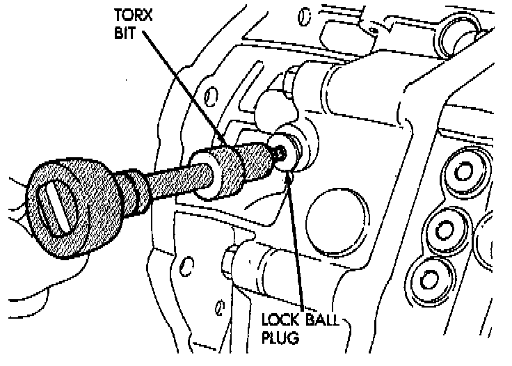 10. Remove plug for reverse shift head lock ball. Plug is at right side of adapter housing near backup light switch.