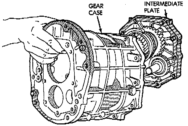 3. Align gear-train and shift rails with mating holes in transmission case and install transmission case to the intermediate plate. Verify that the transmission case is seated on the intermediate plate.
