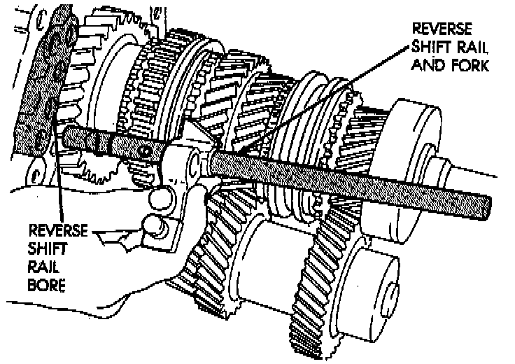 14. Insert fifth gear shift rail through reverse shift fork. Then slide rail into intermediate plate just far enough to secure interlock ball. Do not fully install shift rail at this time.