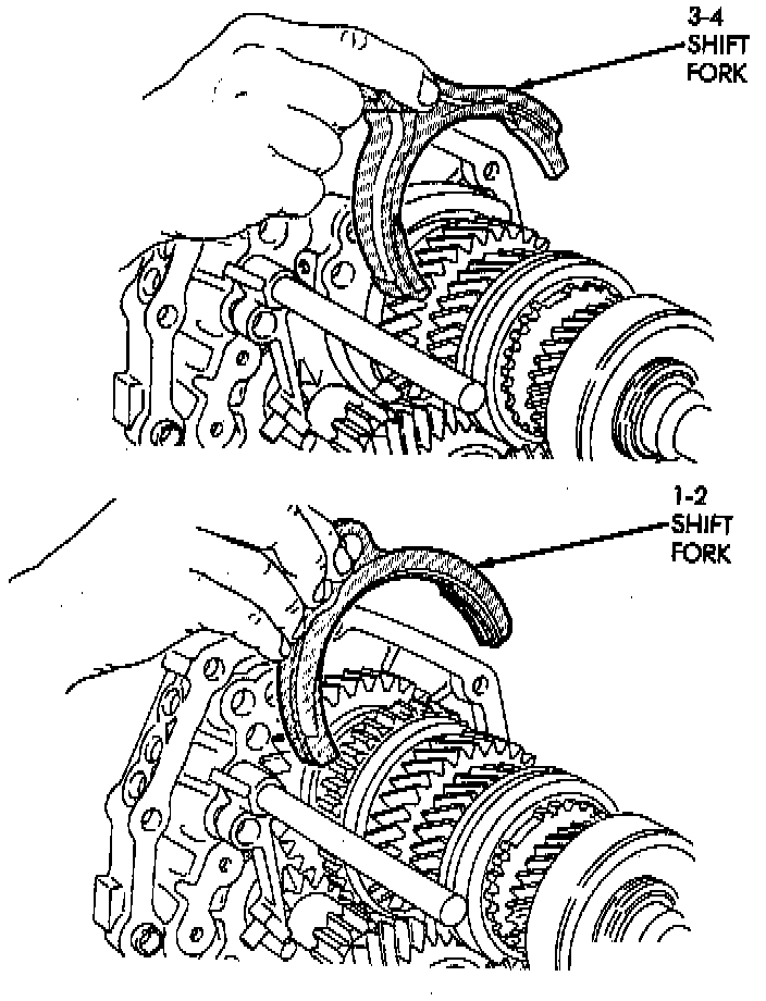 4. Position 1-2 and 3-4 shift forks in synchro sleeves.
