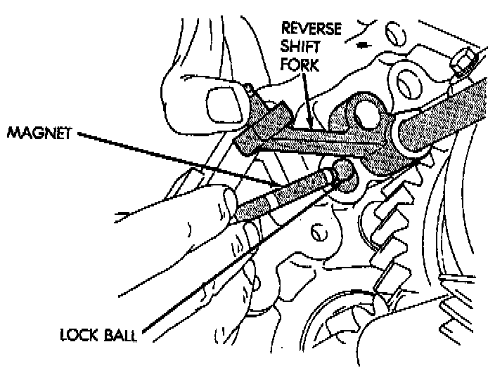 5. Coat reverse rail lock ball with petroleum jelly. Then tilt reverse shift fork upward and insert ball in intermediate plate.