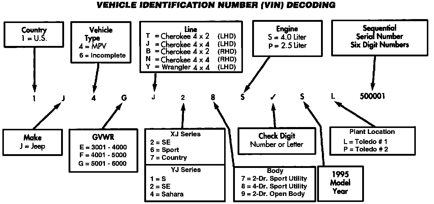 The VIN plate is attached to the top left side of the instrument panel. The VIN contains 17 characters that provide data concerning the vehicle. Refer to the decoding chart to determine the identification of a vehicle.