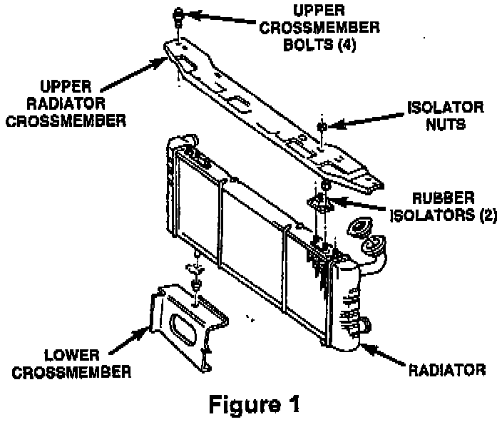 5. Remove the upper radiator support cross member (Fig 1). Scribe prior to removal to keep clearance between the hood and the Grill Opening Panel (GOP) the same during reassembly (Do not remove torx screws from upper support bracket). Remove nuts on GOP to upper support bracket to maintain clearance (Fig. 2).