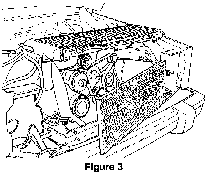 11. Disconnect the transmission oil cooler lines on the right (Drivers side) of the radiator and plug (if equipped). Carefully position the radiator on top of the engine to allow access to the area above the steering gear (Fig. 3). Remove the mechanical fan shroud (if equipped).