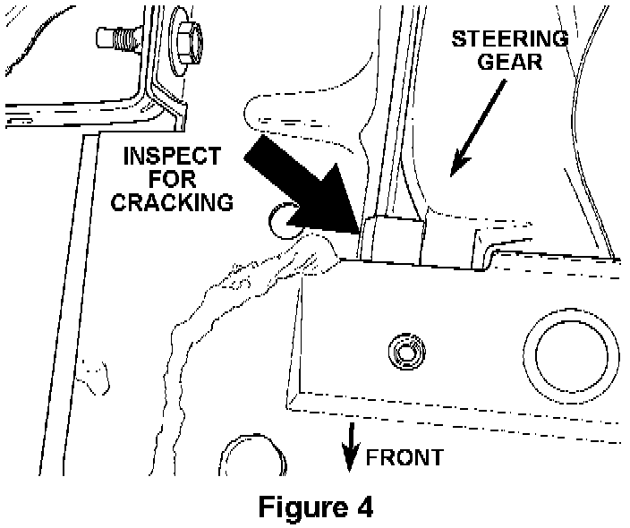 13. Examine the frame area at the steering gear attachment points for any signs (visual or audible) of cracking or deformation while the steering wheel is being turned from full lock left to full lock right, on dry pavement (Fig. 4).