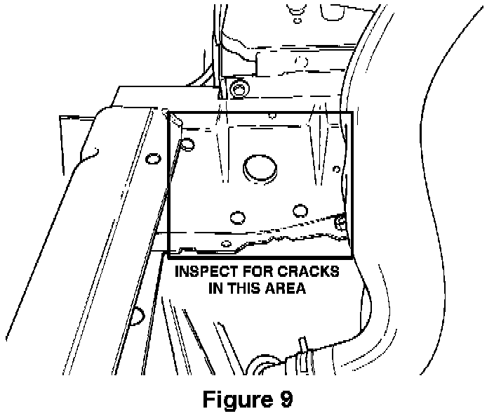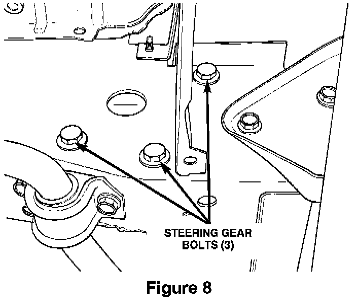 20. Remove the steering gear attaching bolts (Fig. 8), push the steering gear away from the frame and remove the steering gear spacer. Inspect the frame area again for any signs of cracking or deformation (Fig. 9).