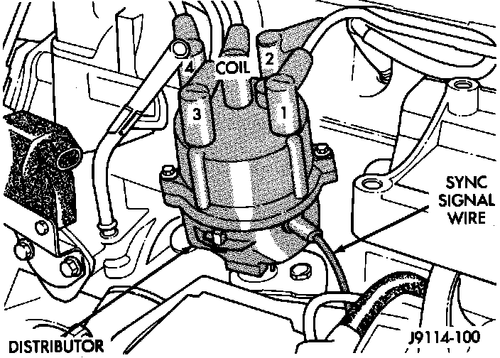 5. Verify that distributor cap is correctly attached to distributor. Ensure that spark plug cables are firmly connected to the distributor cap and the spark plugs in their correct firing order. Ensure that coil cable is firmly connected to distributor cap and coil. Ensure that sync signal generator wire connector is firmly connected to harness connector. Inspect spark plug condition. Connect vehicle to an oscilloscope and inspect spark events for fouled or damaged spark plugs or cables.