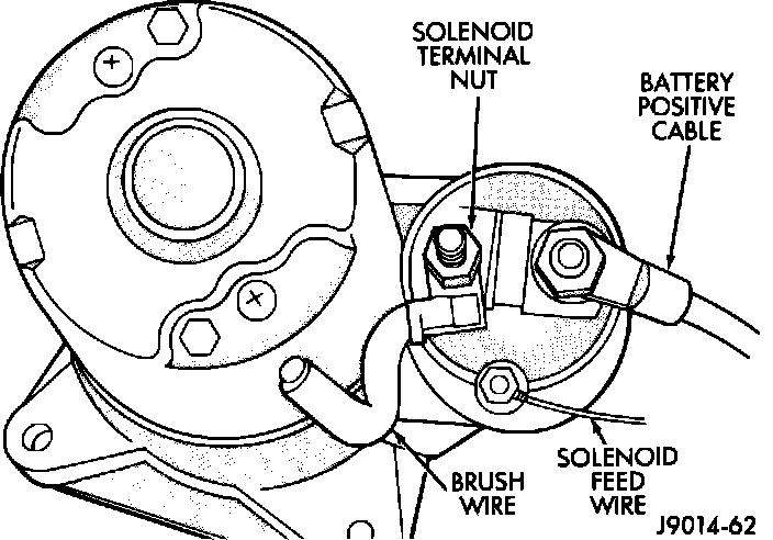 33. Verify that battery cable and solenoid feed wire connections to the starter solenoid are tight and clean. Inspect for chaffed wires or wires rubbing up against other components.